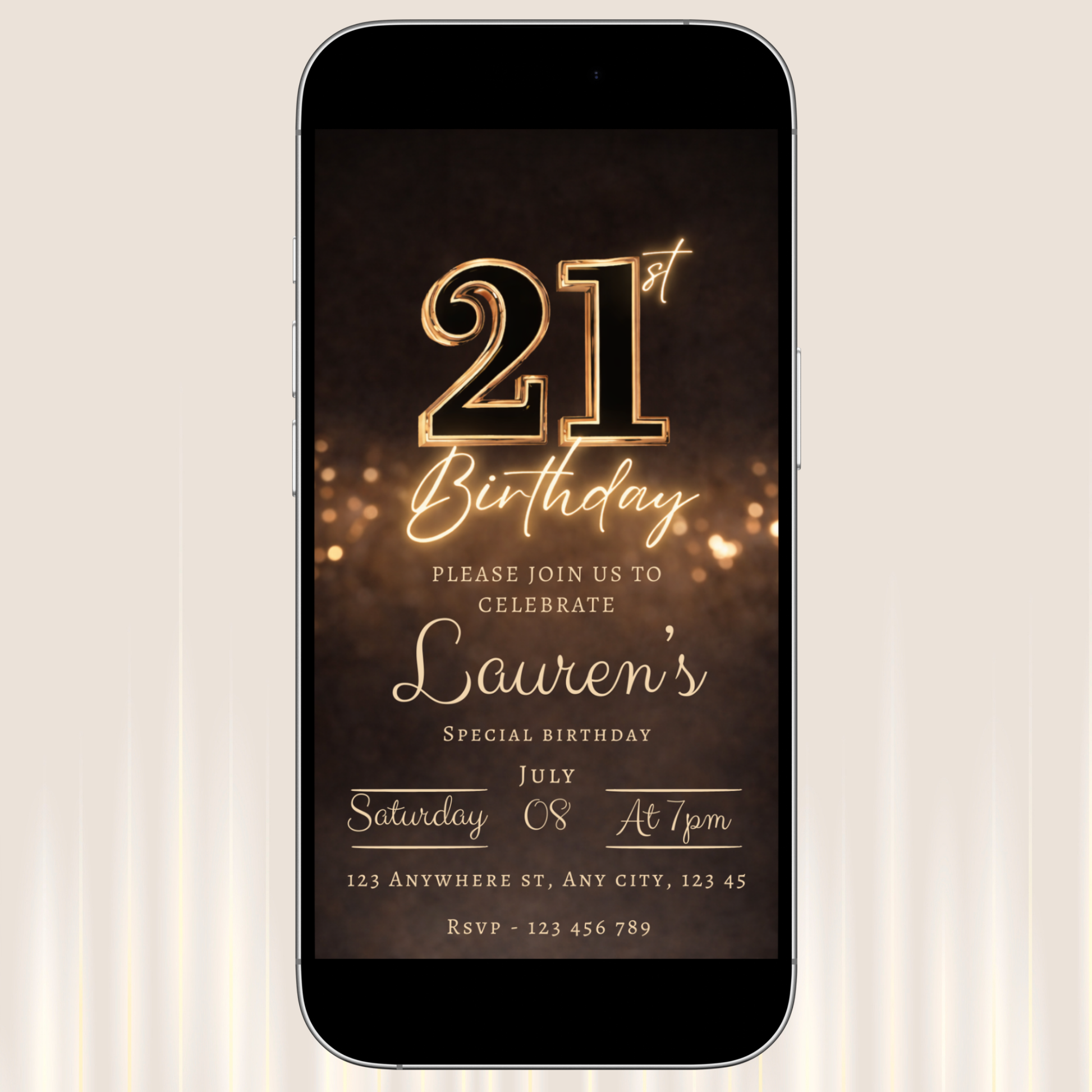 Easily personalize the name, date, time, location, and RSVP details in minutes. The metallic "21st" design and golden decorative elements are beautifully fixed features of this premium template, ensuring a polished, professionally styled invitation every time.
