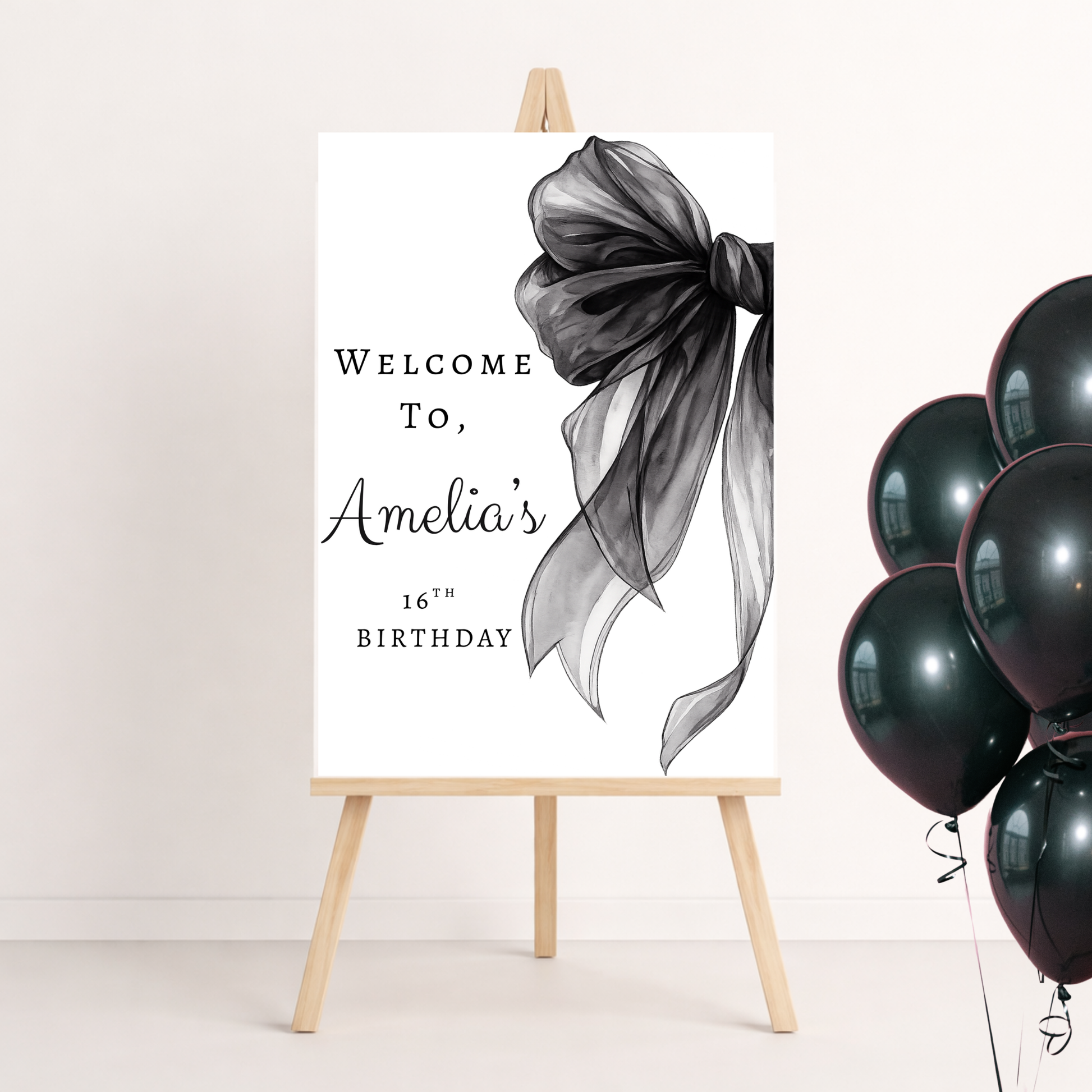 Minimalist Black Bow Invitation Template | Editable Elegant 16th Birthday & Formal Event Invite + Welcome Sign Bundle